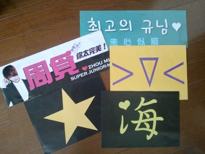 リョウクのスローガン( >▽< )が激カワである。★はウニョクです。この2枚は裏に使用方法まで記載してありました。(リョウクは日本語まで!!) つまりは、各個人のソロの時に掲げてねってことです。郷に入れば郷に従えってことで、台湾ELFちゃんと一緒に律義にやってみました。